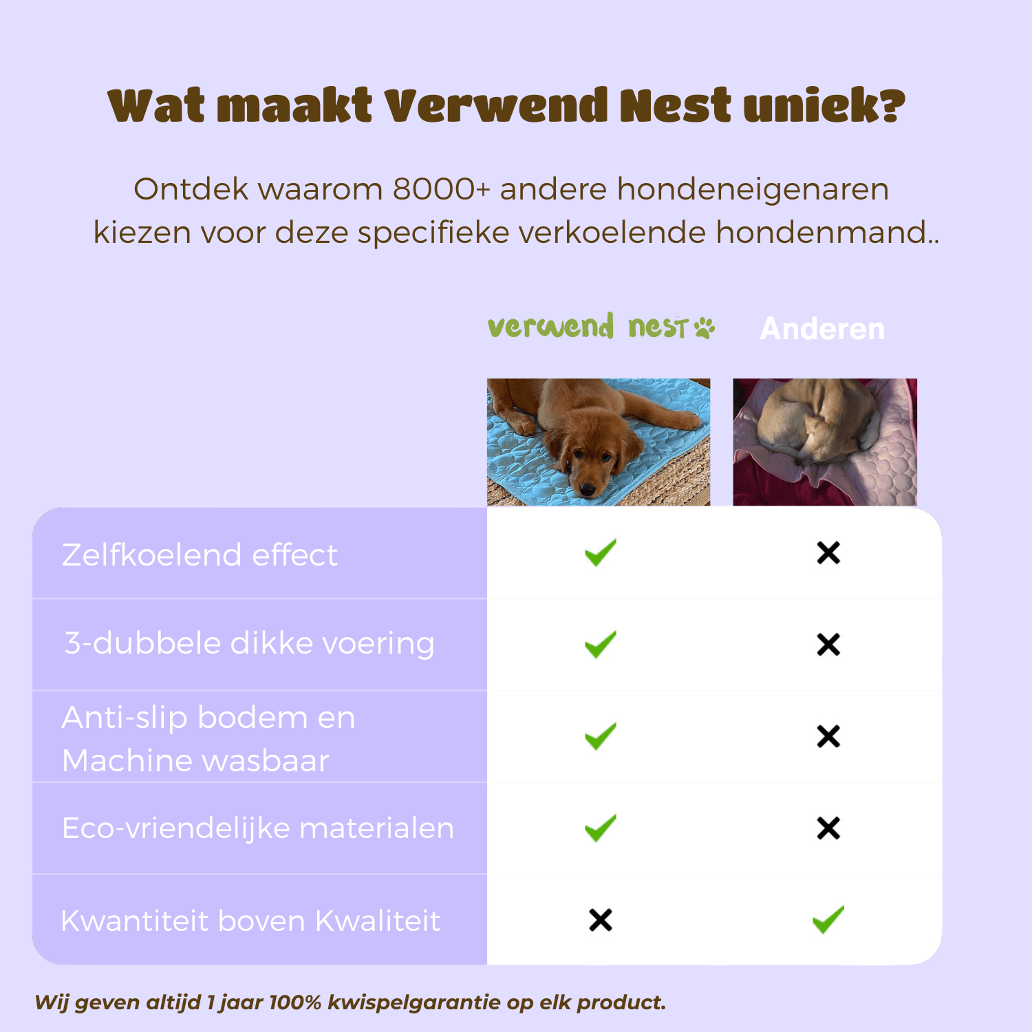 Bij Verwend Nest staan we achter de kwaliteit en het comfort van onze producten. Daarom bieden wij een kwispelgarantie van 180 dagen aan!